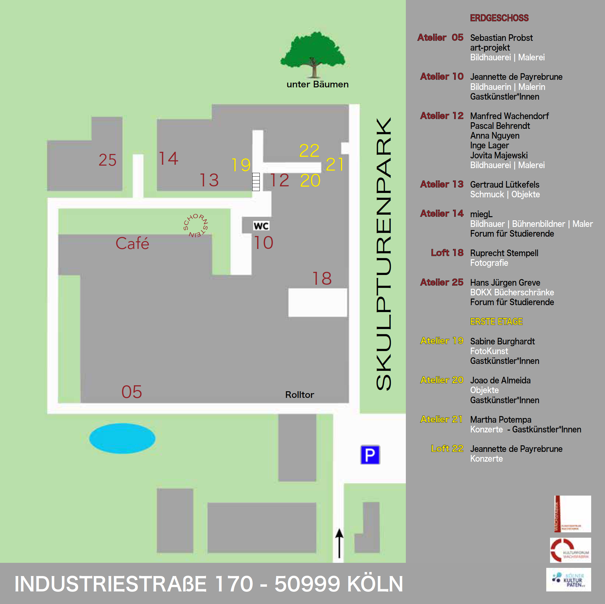Hier sehen Sie den aktuellen Lageplan zum Kunstsonntag im Kunstzentrum Wachsfabrik. Jeden ersten Sonntag im Monat öffnen von 14 bis 18 Uhr die KünstlerInnen der Wachsfabrik Ihre Türen und laden regelmäßig GastkünstlerInnen ein. In der Regel finden in zwei bis vier Ateliers oder Loft’s Gastausstellungen anlässlich des Kunstsonntages statt.